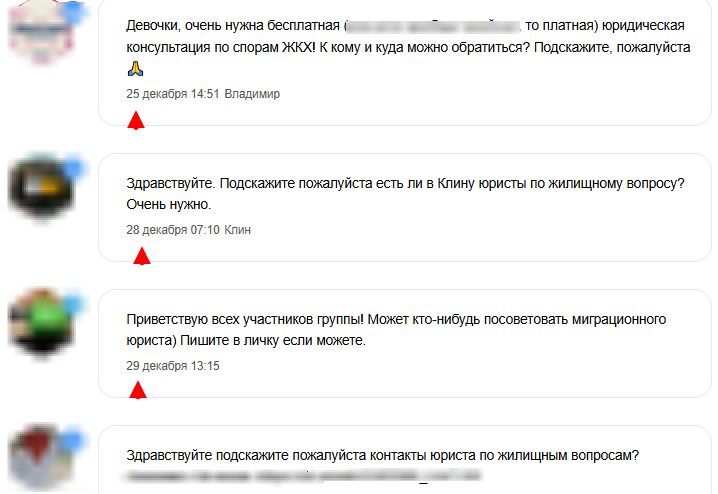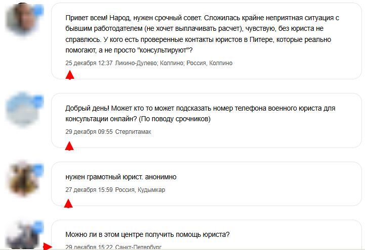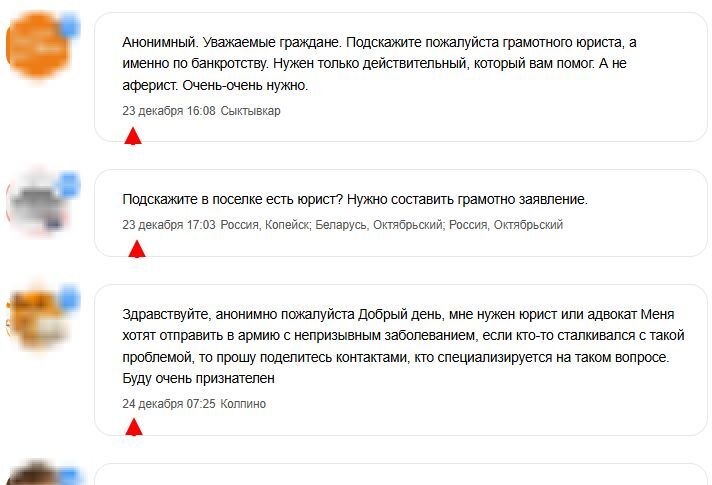 Система автоматически собирает сообщения по заданным запросам, где люди ищут услуги юриста в разных сферах.