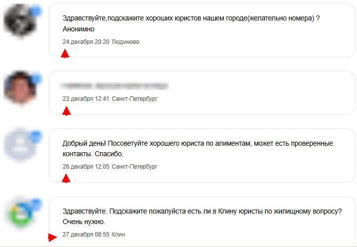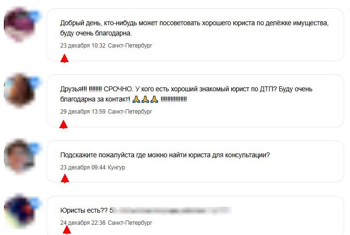 Система автоматически собирает сообщения по заданным запросам, где люди ищут услуги юриста в разных сферах.